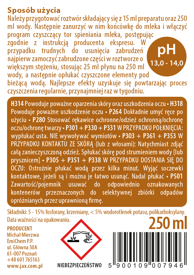 250 ml wody. Następnie zanurzyć w nim końcówkę do mleka i włączyć program czyszczący tor spieniania mleka, postępując zgodnie z instrukcją producenta ekspresu. W przypadku trudnych do usunięcia zabrudzeń należy najpierw namoczyć zabrudzone części w roztworze o większym stężeniu, stosując 25 ml płynu na 250 ml wody, a następnie opłukać czyszczone elementy pod bieżącą wodą. Najlepsze efekty uzyskuje się powtarzając proces czyszczenia regularnie, przynajmniej raz w tygodniu.