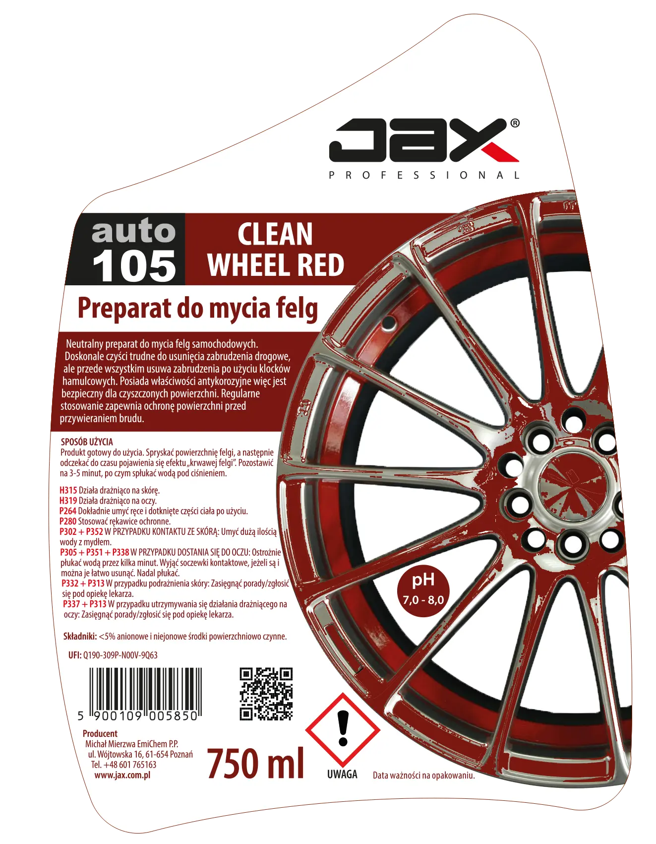JAX PROFESSIONAL 105 Clean Wheel Red to nowoczesny, wysokowydajny środek czyszczący do felg, zaprojektowany do skutecznego usuwania najbardziej uporczywych zabrudzeń. Specjalna formuła produktu reaguje z cząsteczkami żelaza, zmieniając kolor na czerwony podczas pracy, co pozwala wizualnie śledzić proces czyszczenia. Idealny do usuwania pyłu z klocków hamulcowych oraz innych zanieczyszczeń drogowych.
