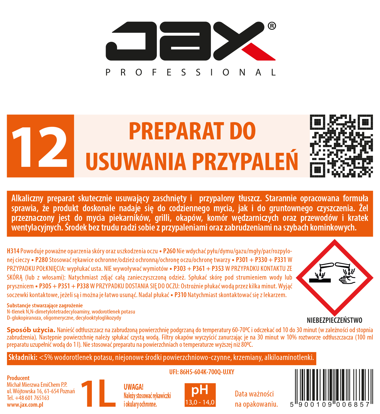 JAX PROFESSIONAL 12 1L - PŁYN DO USUWANIA PRZYPALEŃ do czyszczenia piekarników, okapów, grilli, do przewodów i kratek wentylacyjnych do usuwania zaschniętego przypalonego tłuszczu