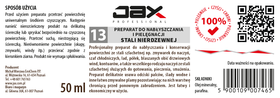 JAX PROFESSIONAL 13 50 ml - PREPARAT DO NABŁYSZCZANIA I PIELĘGNACJI STALI NIERDZEWNEJ urządzeń i maszyn ze stali nierdzewnej, mebli wykonanych ze stali nierdzewnej, do lad, szaf chłodniczych
