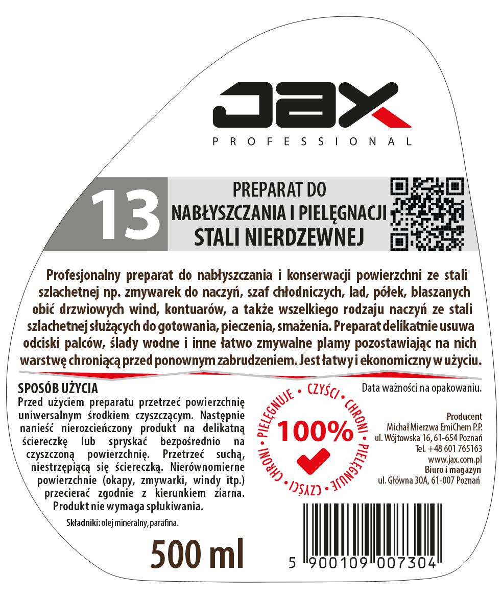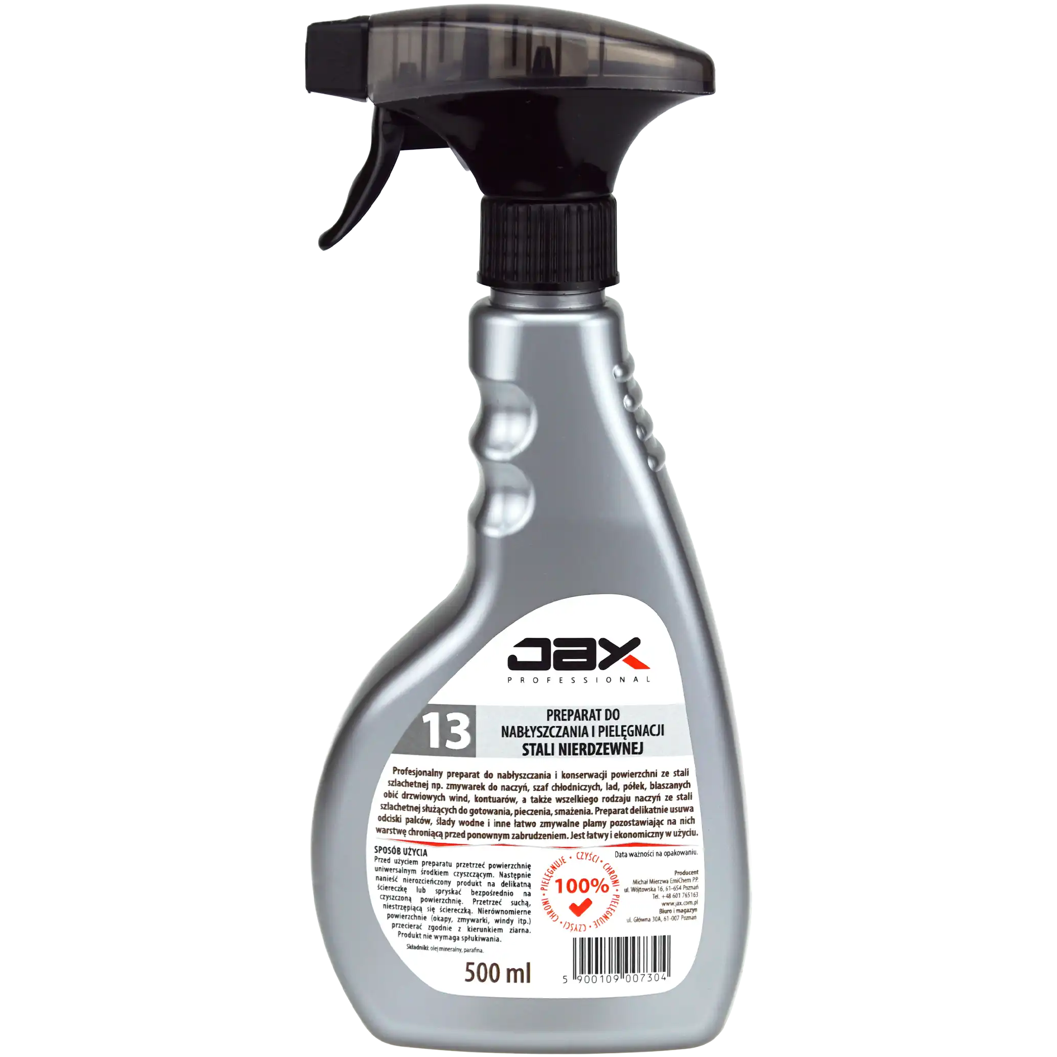 JAX PROFESSIONAL 13 500 ml - PREPARAT DO NABŁYSZCZANIA I PIELĘGNACJI STALI NIERDZEWNEJ urządzeń i maszyn ze stali nierdzewnej, mebli wykonanych ze stali nierdzewnej, do lad, szaf chłodniczych