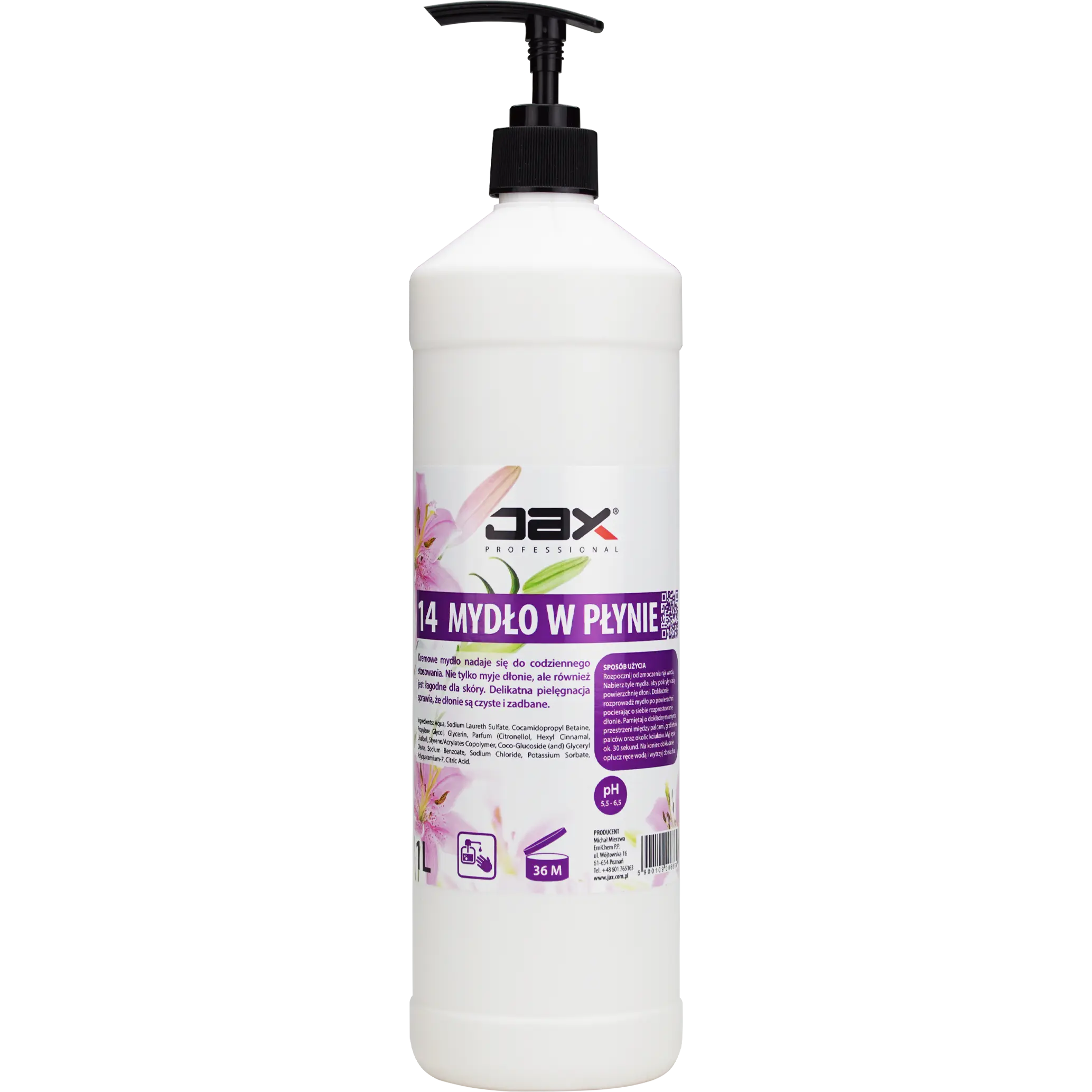 JAX PROFESSIONAL 14 1L - MYDŁO W PŁYNIE kremowe, delikatne do higienicznego mycia rąk i ciała, nie wysusza skóry, do mycia twarzy, do mycia włosów, z efektem bakteriobójczym