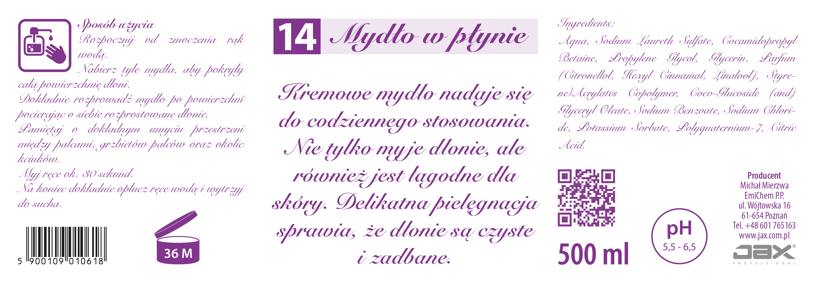 JAX PROFESSIONAL 14 500 ml - MYDŁO W PŁYNIE kremowe, delikatne do higienicznego mycia rąk i ciała, nie wysusza skóry, do mycia twarzy, do mycia włosów, z efektem bakteriobójczym