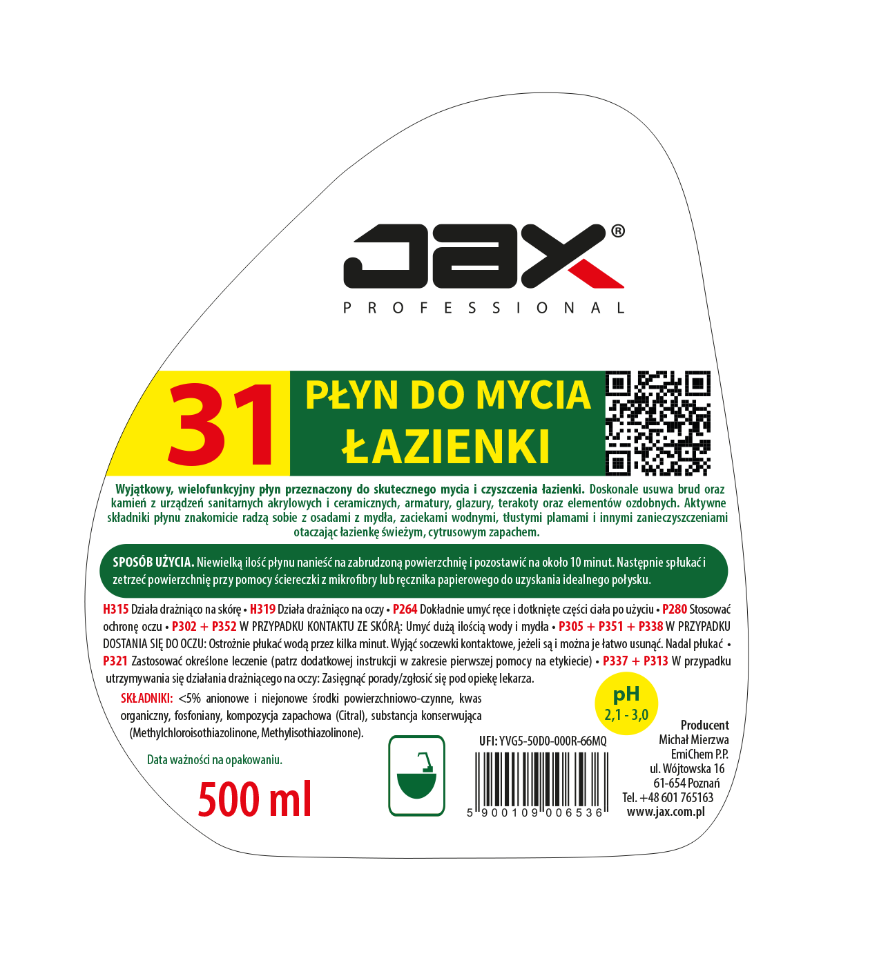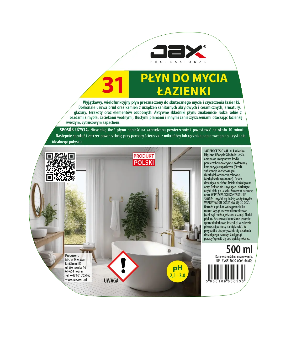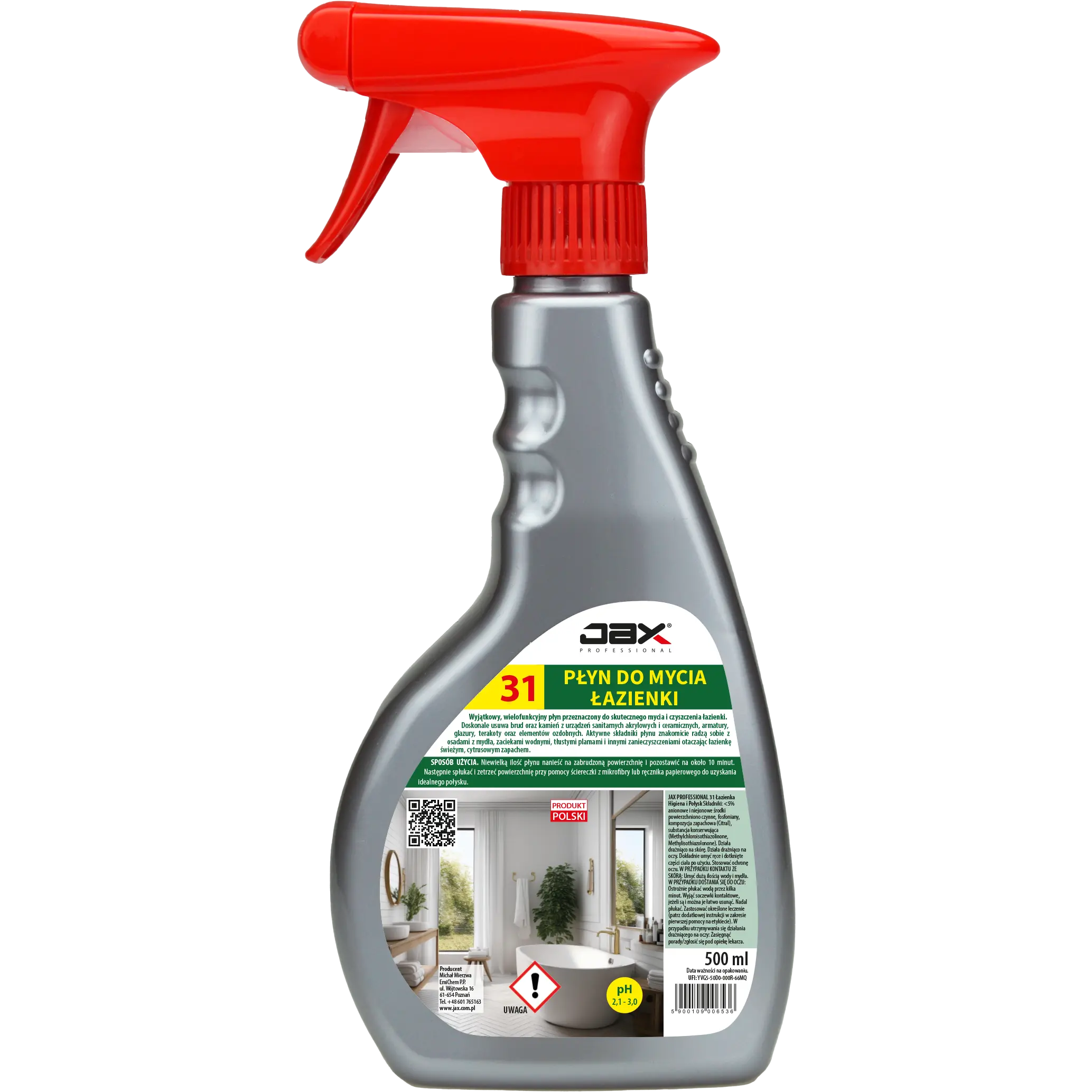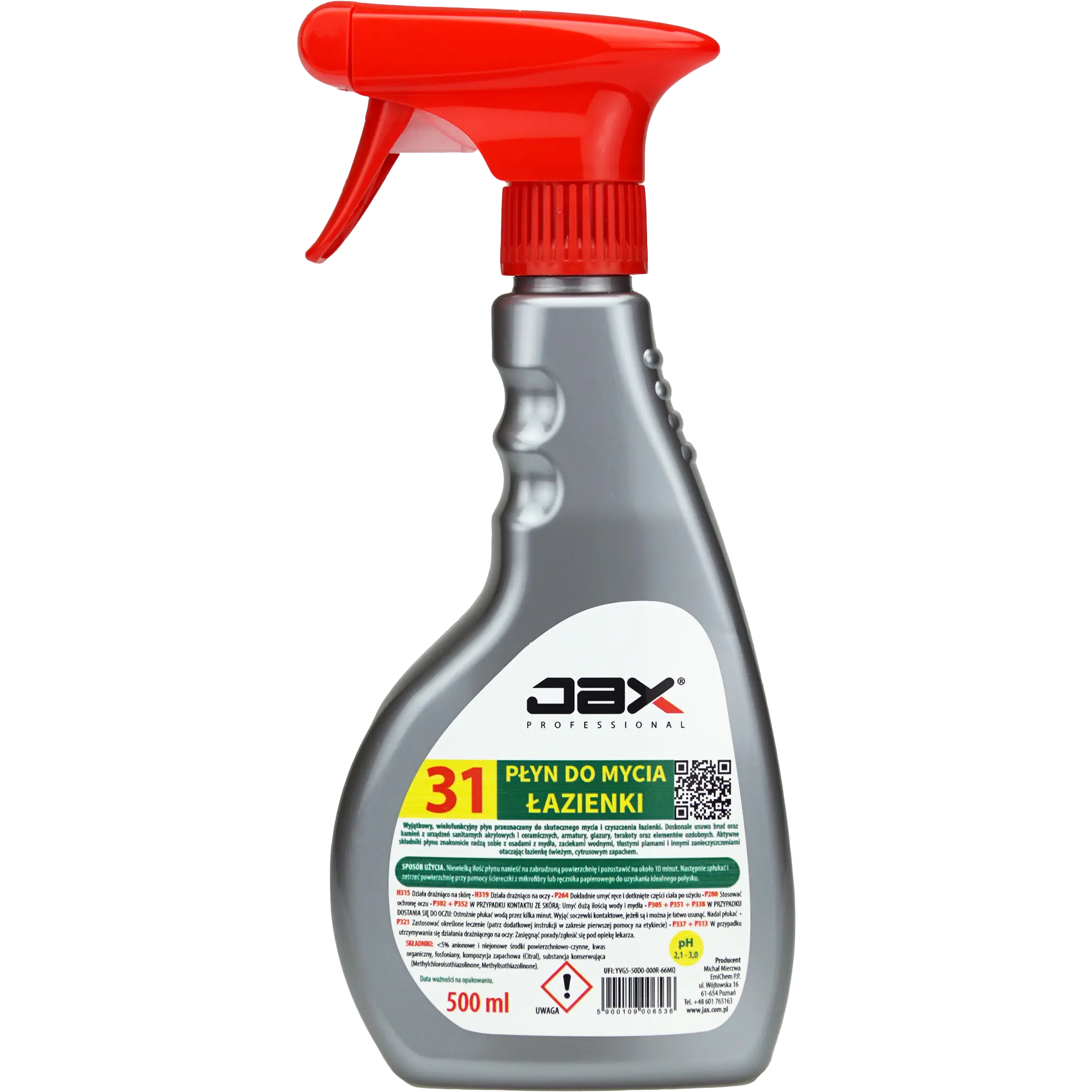 JAX PROFESSIONAL 31 500 ml - PŁYN DO MYCIA I PIELĘGNACJI ŁAZIENKI usuwa osady z mydła i kamienia, zapobiega osadzaniu się zabrudzeń, do kabin prysznicowych, baterii, glazury, ceramiki, terakoty i aluminium
