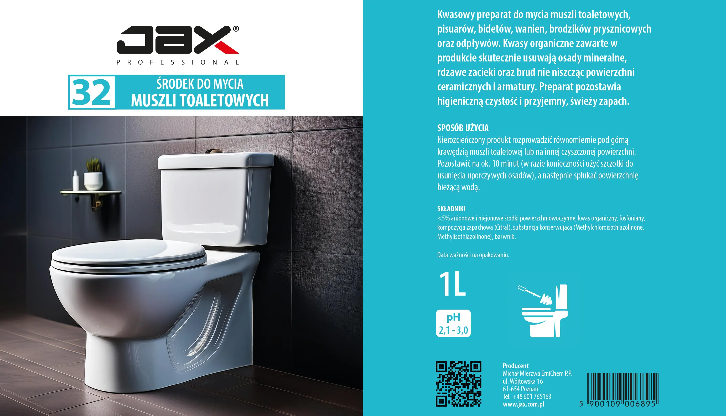 JAX PROFESSIONAL 32 1L - PŁYN DO MYCIA MUSZLI TOALETOWYCH pisuarów, do czyszczenia mycia bidetów, wanien, brodzików prysznicowych, odpływów, usuwa brud, kamień, osady mineralne i rdzawe zacieki