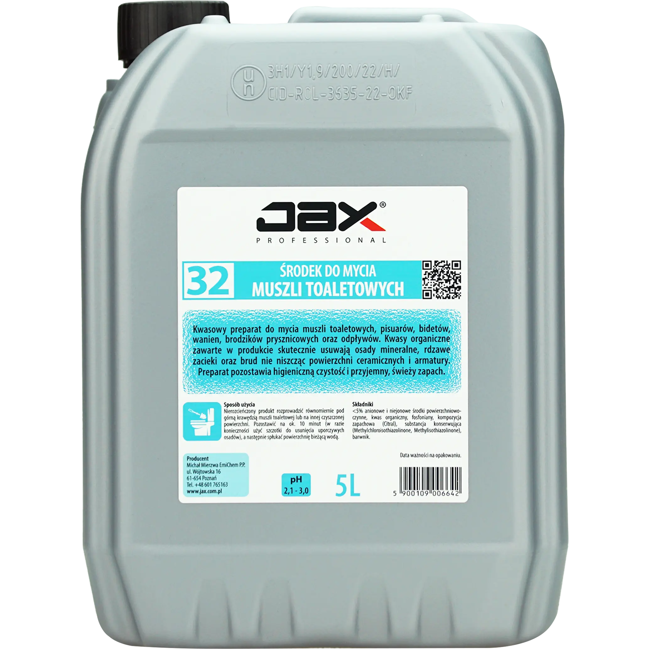 JAX PROFESSIONAL 32 5L - PŁYN DO MYCIA MUSZLI TOALETOWYCH pisuarów, do czyszczenia mycia bidetów, wanien, brodzików prysznicowych, odpływów, usuwa brud, kamień, osady mineralne i rdzawe zacieki