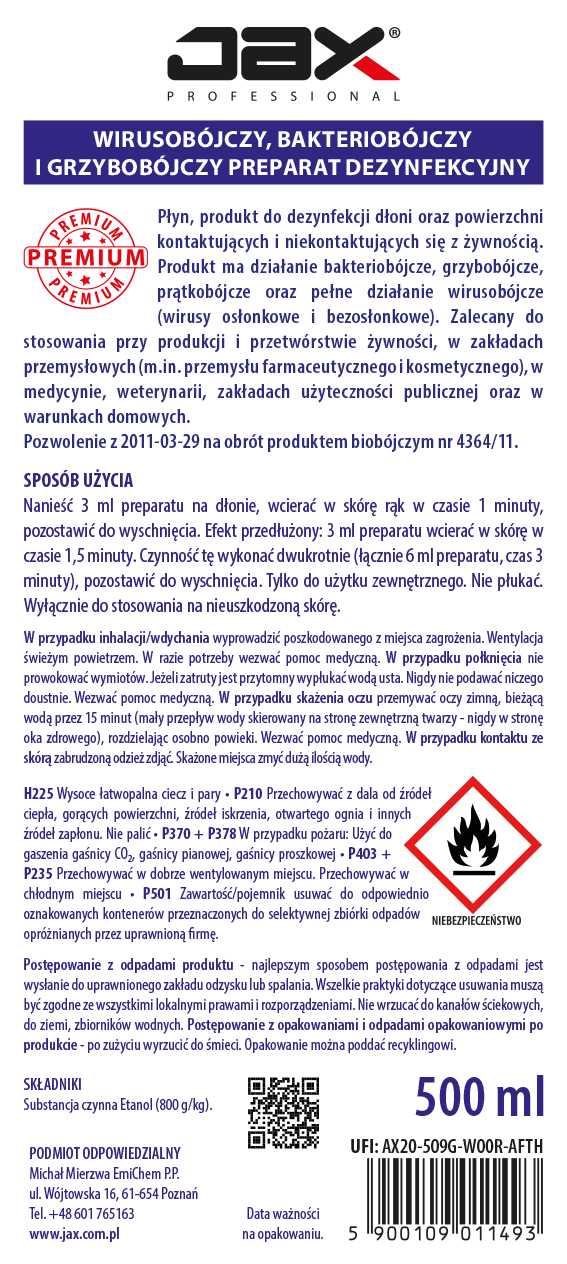 JAX PROFESSIONAL 34 PREMIUM 500 ml refill - WIRUSOBÓJCZY, BAKTERIOBÓJCZY I GRZYBOBÓJCZY PREPARAT DEZYNFEKCYJNY