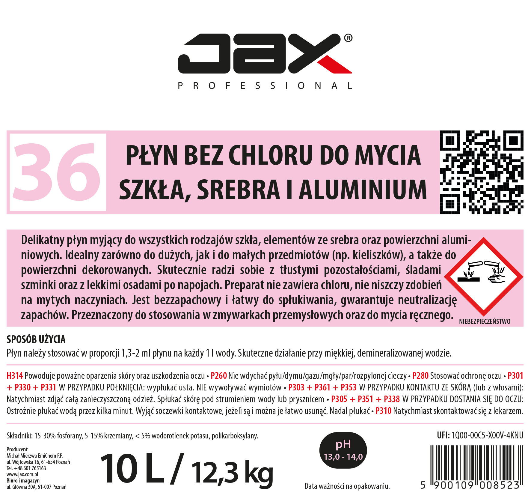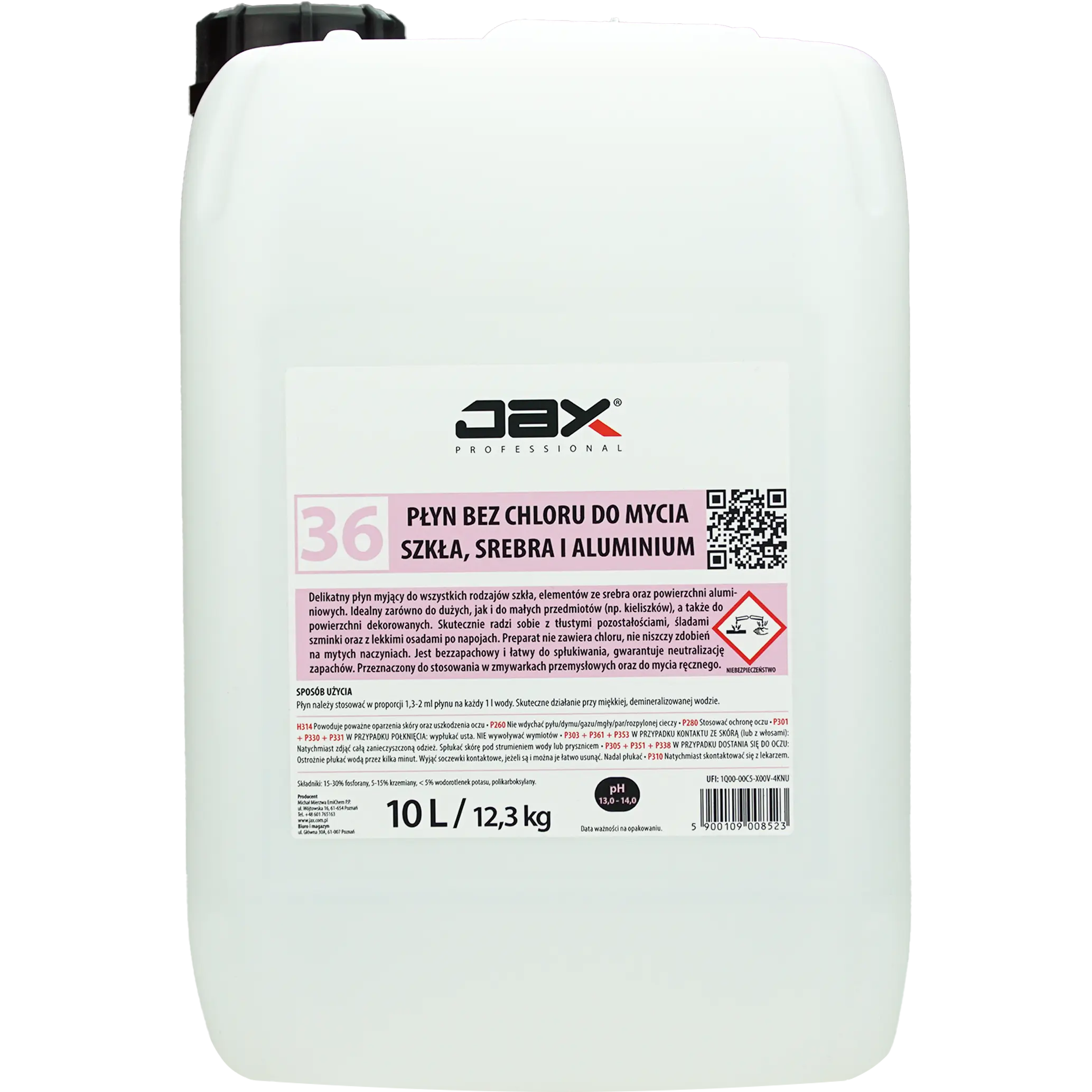JAX PROFESSIONAL 36 10L - PŁYN BEZ CHLORU DO MYCIA SZKŁA, SREBRA I ALUMINIUM delikatny, niskoalkaliczny środek do mycia wszystkich rodzajów szkła, do mycia srebra oraz powierzchni aluminiowych