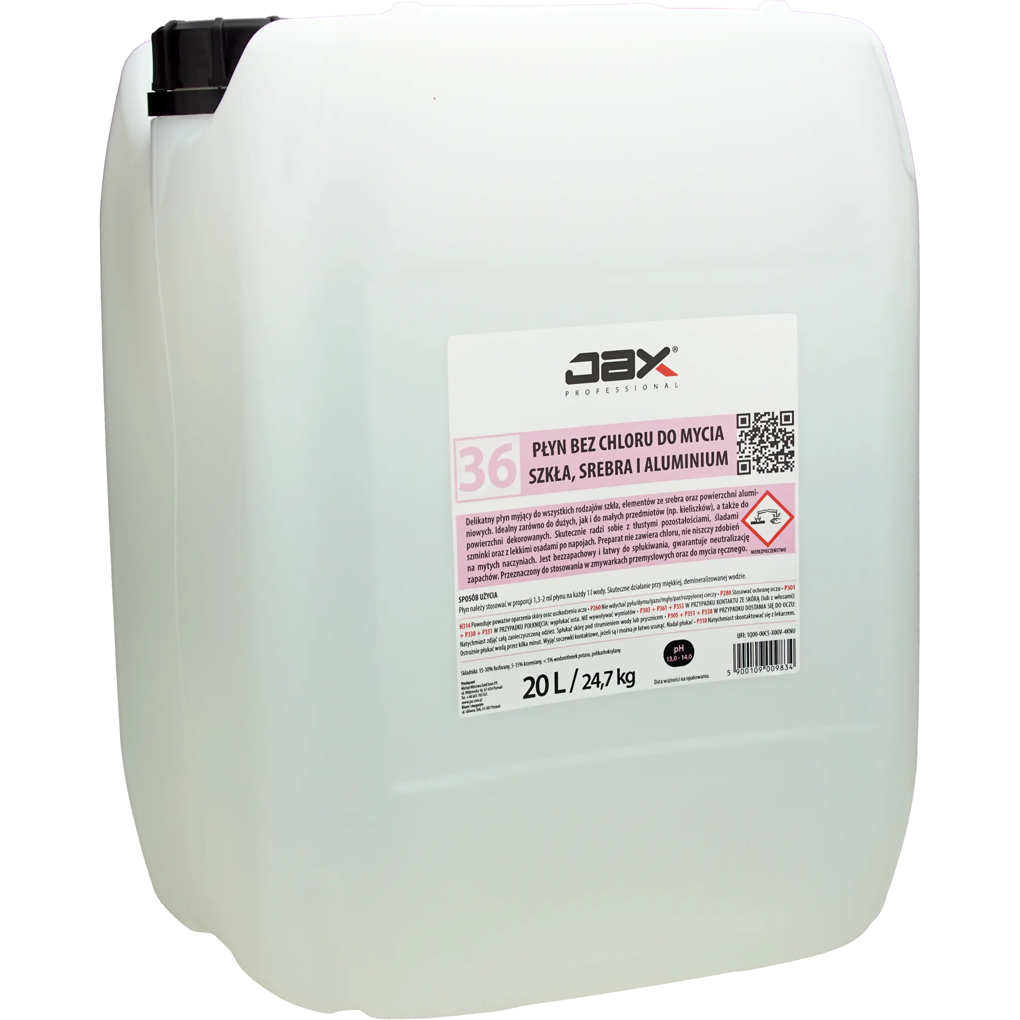 JAX PROFESSIONAL 36 20L - PŁYN BEZ CHLORU DO MYCIA SZKŁA, SREBRA I ALUMINIUM delikatny, niskoalkaliczny środek do mycia wszystkich rodzajów szkła, do mycia srebra oraz powierzchni aluminiowych