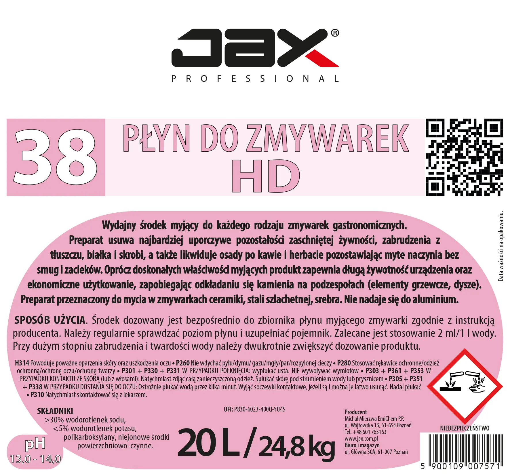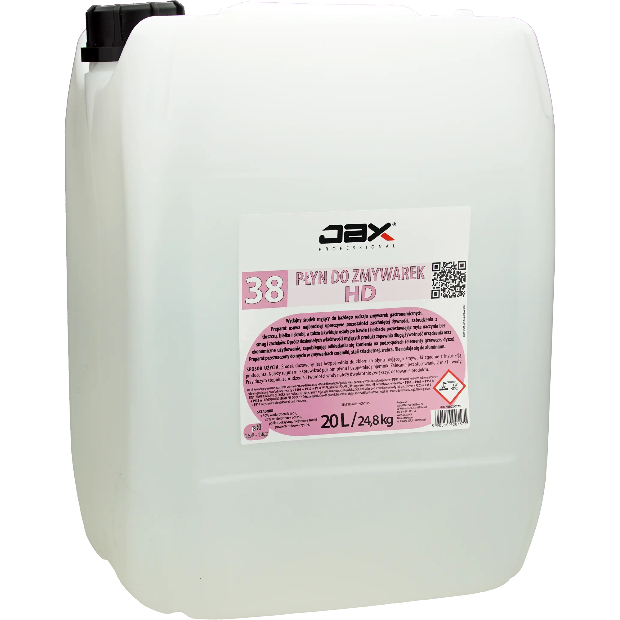 JAX PROFESSIONAL 38 20L - PŁYN DO ZMYWAREK HD do mycia ceramiki, stali szlachetnej, do mycia srebra, usuwa osady po kawie i herbacie, zmywa zabrudzenia z białka, skrobi