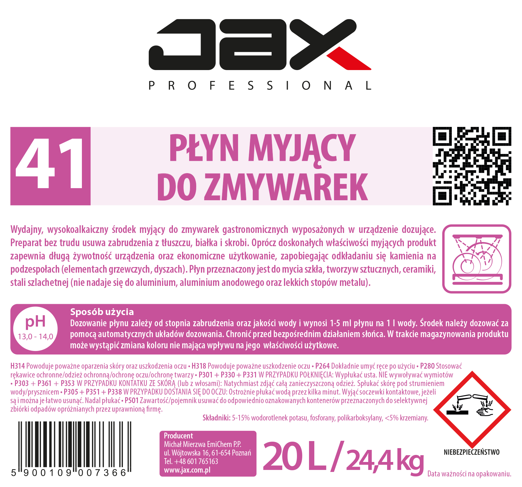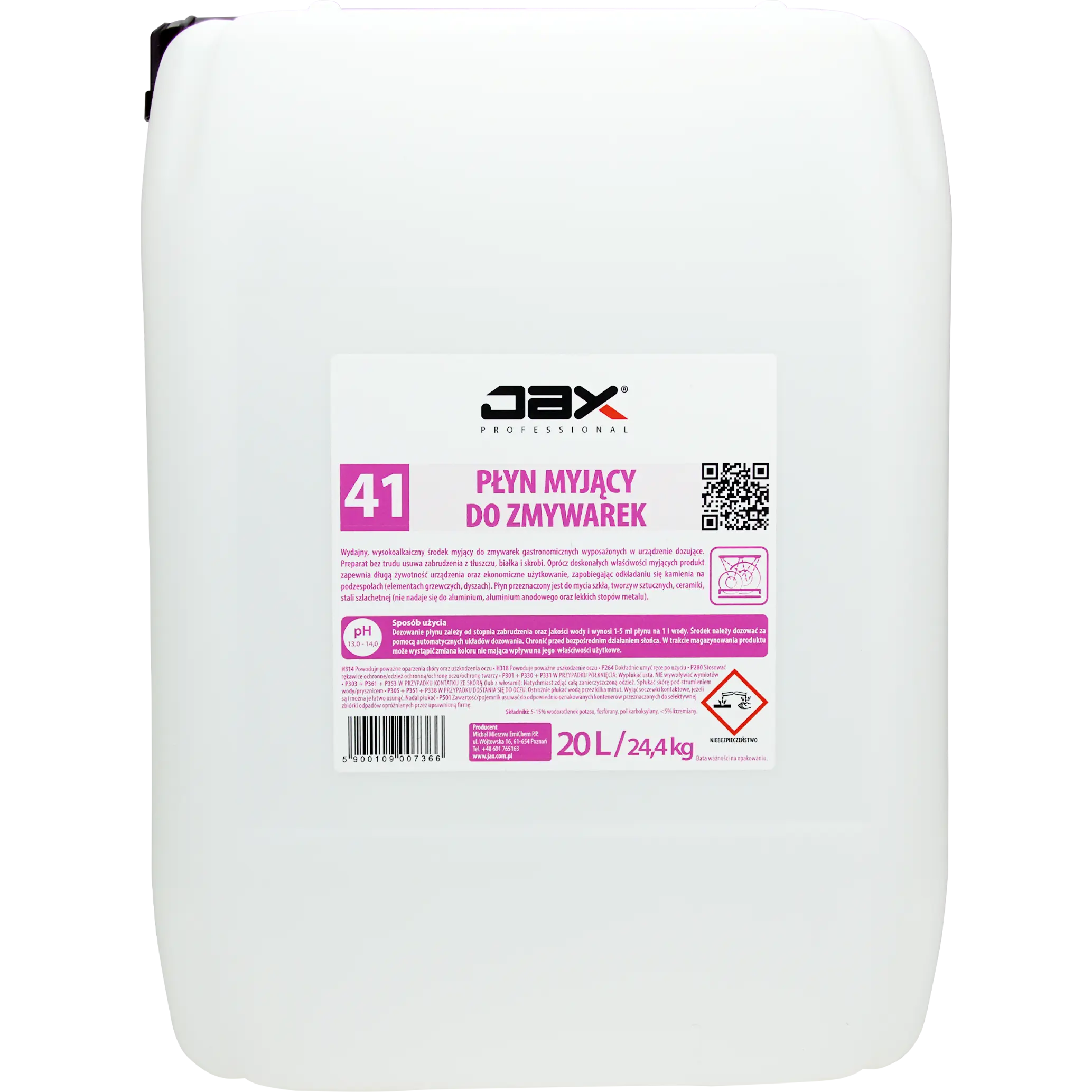 JAX PROFESSIONAL 41 20L - PŁYN MYJĄCY DO ZMYWAREK usuwa zabrudzenia z tłuszczu, białka i skrobi, do mycia szkła, ceramiki, mycia tworzyw sztucznych, stali szlachetnej