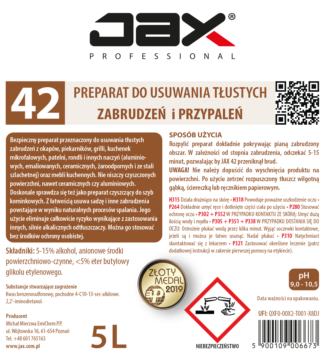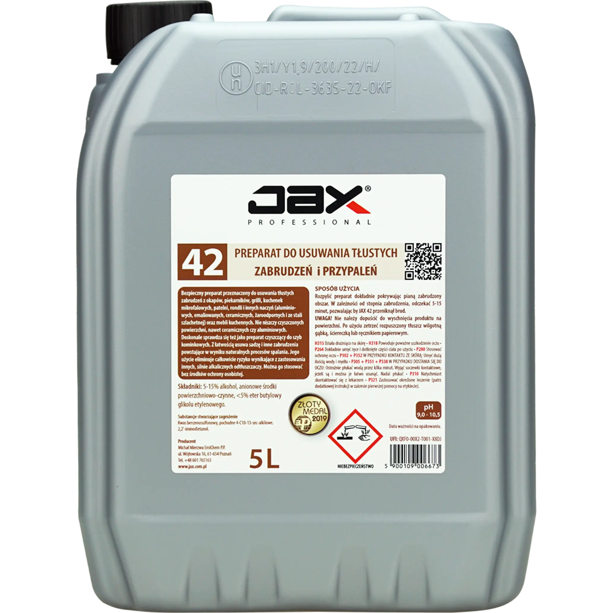 JAX PROFESSIONAL 42 5L - DO USUWANIA TŁUSTYCH ZABRUDZEŃ i PRZYPALEŃ, mycia okapów, piekarników, grilli, kuchenek mikrofalowych, patelni, rondli, blach, form do pieczenia, naczyń emaliowanych, ceramicznych, żaroodpornych, ze stali i aluminium