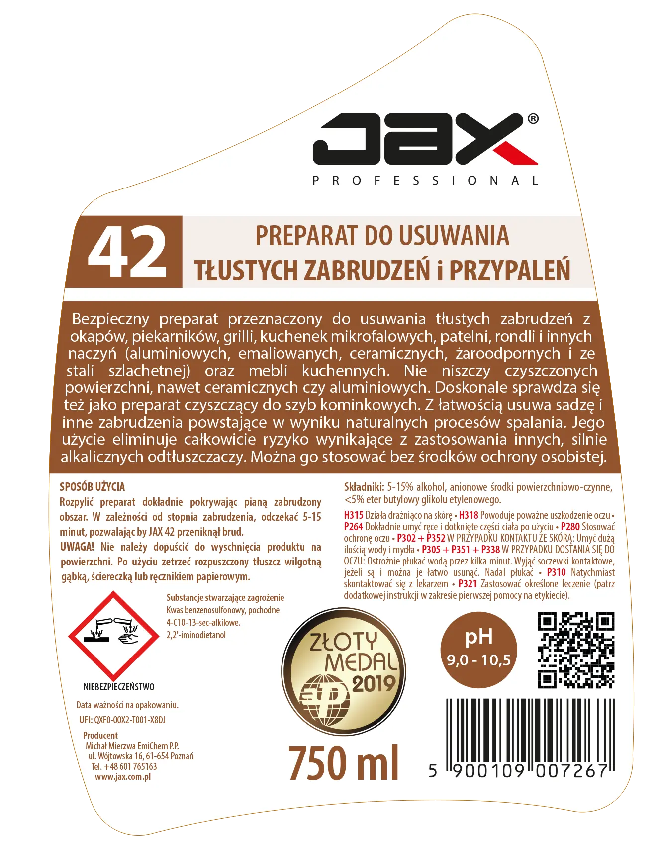 JAX PROFESSIONAL 42 750 ml - DO USUWANIA TŁUSTYCH ZABRUDZEŃ i PRZYPALEŃ, mycia okapów, piekarników, grilli, kuchenek mikrofalowych, patelni, rondli, blach, form do pieczenia, naczyń emaliowanych, ceramicznych, żaroodpornych, ze stali i aluminium