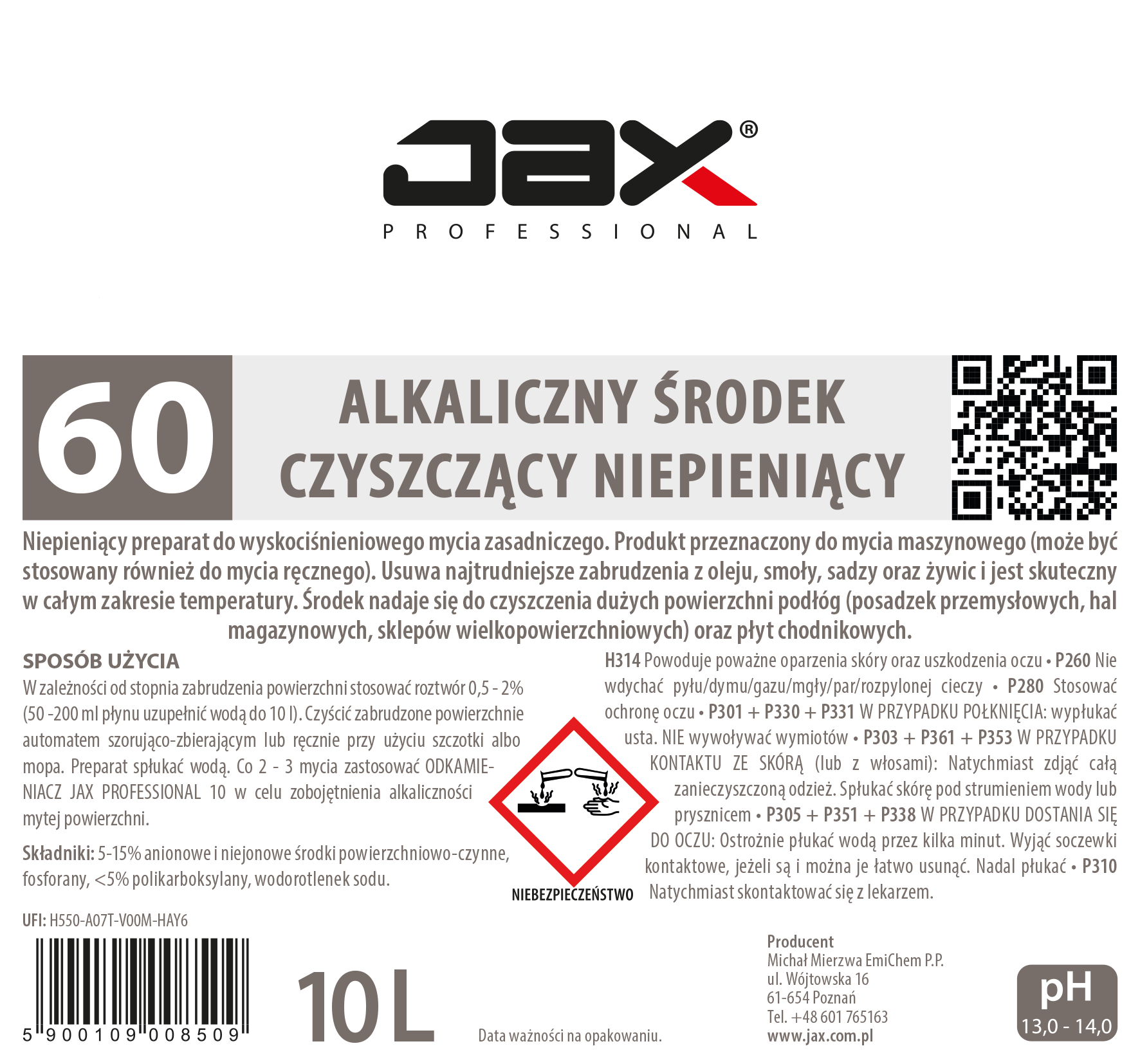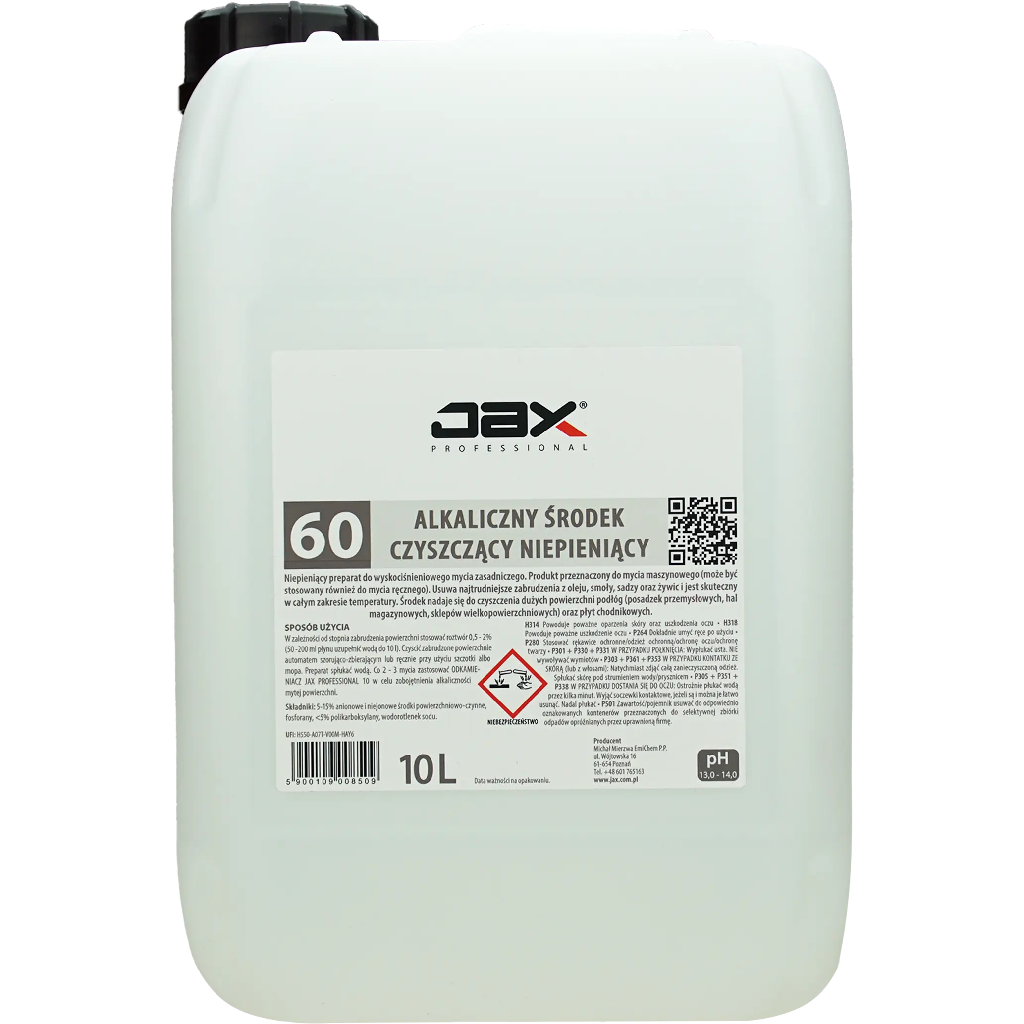 JAX PROFESSIONAL 60 10L - ALKALICZNY ŚRODEK CZYSZCZĄCY NIEPIENIĄCY do czyszczenia dużych powierzchni podłóg, do posadzek przemysłowych, hal magazynowych, do sklepów wielkopowierzchniowych, do płyt chodnikowych